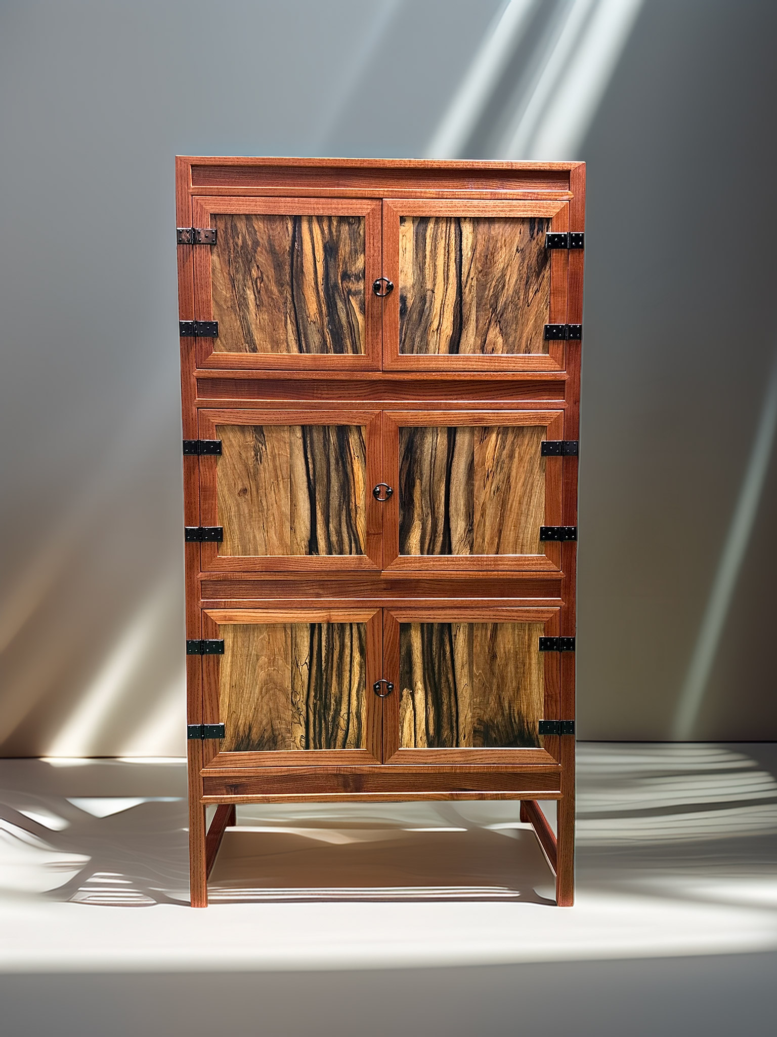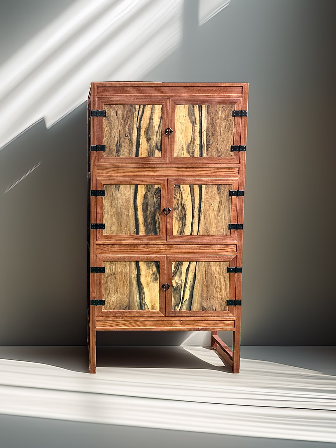 문판에 먹감을 사용한 것은 이 가구의 인상을 형태보다 재료에서 먼저 드러내고자 했기 때문입니다. 짙은 색과 강한 결을 가진 먹감은, 문이 닫혀 있을 때는 하나의 묵직한 화면처럼 보이면서도, 가까이 다가가면 각각 다른 표정을 가진 나무의 결들이 드러나도록 합니다. 서로 다른 무늬를 가진 판들이 반복되어 배치되면서, 동일한 구조 안에서도 미묘한 차이와 리듬이 생기도록 의도했습니다. 이는 ‘같음’과 ‘다름’이 동시에 공존하는 상태를 가구 안에 담고자 한 선택이기도 합니다.