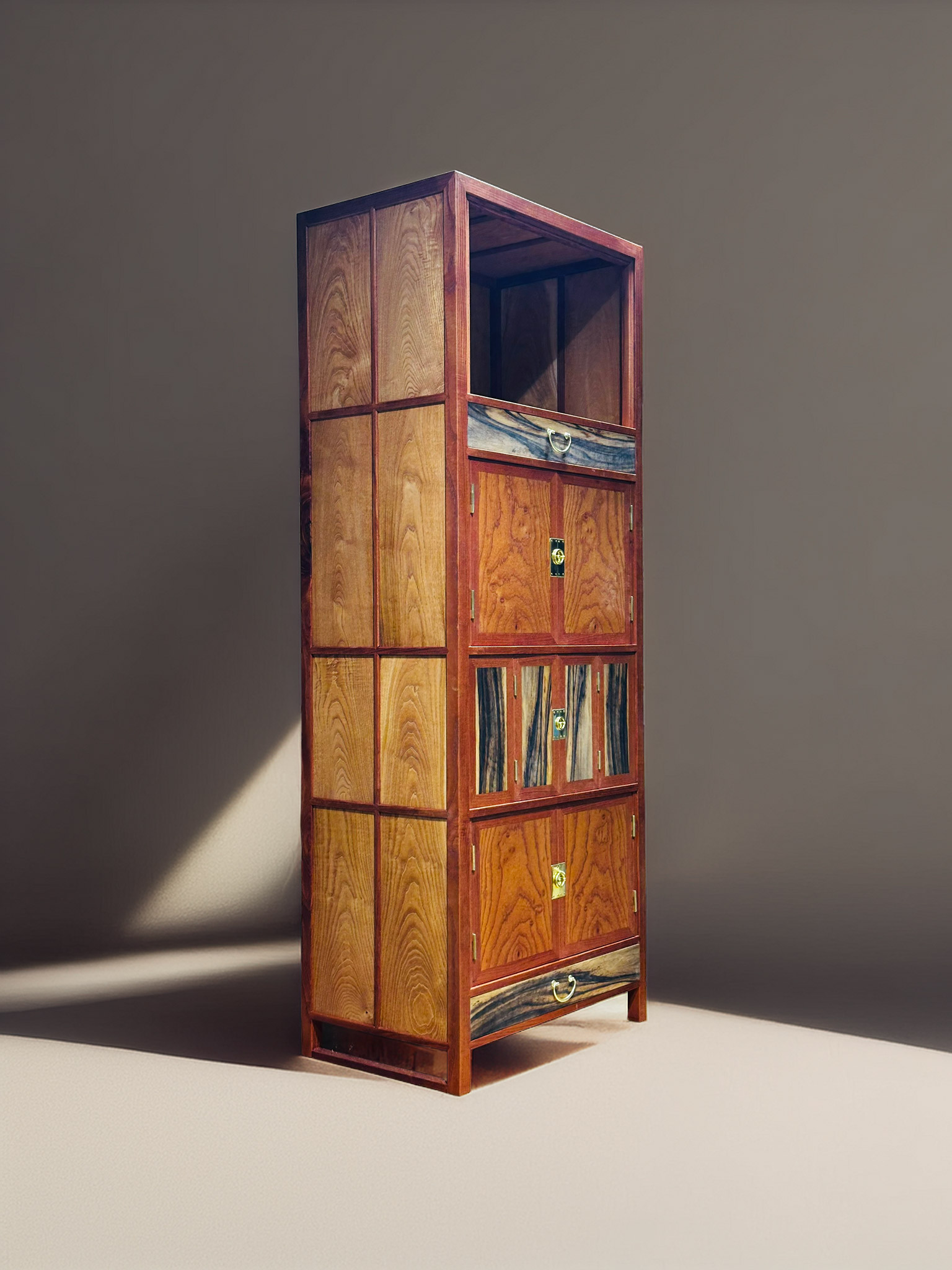 재료의 사용 역시 이 구조를 따라 리듬을 이루도록 구성되었습니다. 짙은 결을 가진 판재와 비교적 밝은 톤의 몸체가 교차하며 배치되어, 반복되는 구조 안에서도 각 층이 서로 다른 표정을 갖도록 의도했습니다. 특히 문판과 서랍 전면에 사용된 재료들은, 가구를 하나의 덩어리로 보이게 하기보다, 여러 개의 장면이 겹쳐진 구조처럼 읽히도록 합니다. 이는 수납이라는 기능을 단일한 용도가 아닌, 다양한 성격의 공간들이 모인 구조로 바라보려는 시도이기도 합니다.